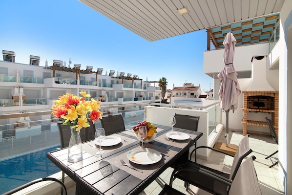 The vacation home boasts a private outdoor area with garden furniture, a covered terrace, a balcony and a barbecue. A shared outdoor area, consisting of a pool, a children's pool and an outdoor shower, is also available for your use.