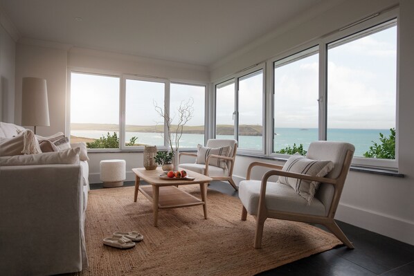 When it's time to unwind, take the steps leading up to the vaulted living area with a fireplace and views out to sea. The high ceiling gives the space a grand feel, and the fireplace creates a warm and inviting atmosphere. You'll be able to relax and enjoy the breathtaking views of the ocean while staying cosy and comfortable. If you fancy watching a film take the steps down to the snug room where you'll find a plush sofa.