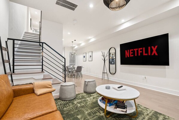 ★ TWO LIVING ROOMS & 2 KITCHENS ★ Each floor features its own open-plan living room and full kitchen: • Comfortable seating and Smart TVs • Kitchens fully equipped with stainless steel appliances, Keurig machine, cooking basics, and more • Dining area with seating for 6