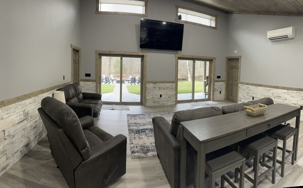 Gone Fishing cabin boasts 2 bedrooms, 2 full baths, combined open kitchen, dining and living space, laundry with washer and dryer, and picturesque views from every space in the cabin. Bedroom 1 offers a full over full bunk bed with a pull-out twin trundle, TV, closet, and attached full bathroom, also accessible through the laundry room situated off of the main living space. Bedroom 2 has a queen bed, private full bath, TV, and closet. Kitchen includes refrigerator, dishwasher, microwave, toaster, coffee pot, glassware, dining, cooking and silverware sets, and table that seats 6. Living space has a sofa that pulls out into a queen bed, love seat, chair, and TV. All have sliding glass doors with amazing views of the great outdoors and the Clarion River that lead to a covered patio with chairs. Beyond the patio is a custom-made fire ring with plenty of seating and a covered pavilion with electric, both situated on the banks of the Clarion River. Cable TV, Wi-Fi, heat and air conditioning. Cut firewood is located on the property. It is available for purchase on a consumption basis and honor system during rental.