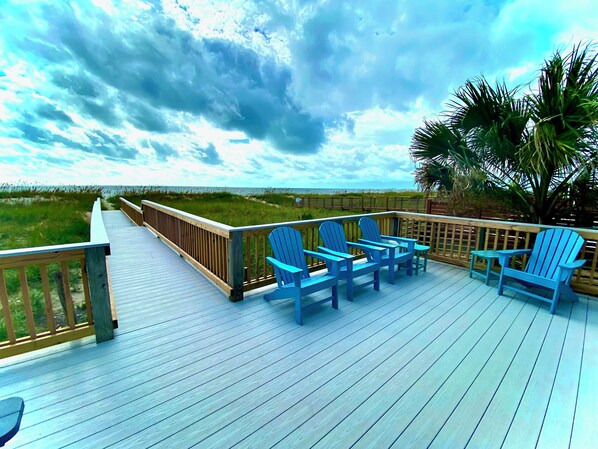Dette hjem har et rummeligt dæk med en overdækket veranda swing, en grill, et picnicbord og Adirondack stole. Perfekt til din picnic eller grill, lytte til brændingen og følelsen af havbrisen. Se bølgerne rulle ind, måger, der flyver forbi, og delfiner, der boltrer sig i havet - lige foran dig! Du har din egen gangbro til stranden og bekvemmeligheden ved en udendørs bruser. Der er masser af parkeringspladser også.