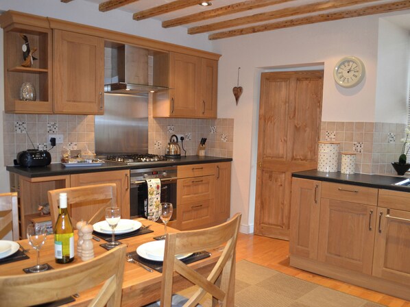 Køkken / spiseplads: Med elektrisk ovn og gaskomfur, radio med i-Pod dock og mikrobølgeovn.