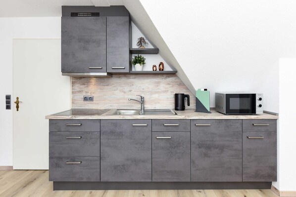 Størrelse ca. 60 kvadratmeter, stue med integreret køkken, soveværelse, andet separat soveværelse / børneværelse, badeværelse med bruser, forfængelighed og toilet, øverste etage, balkon, eksklusivt til ikke-ryger, ideel til 2 til 4 personer og også et lille barn.
