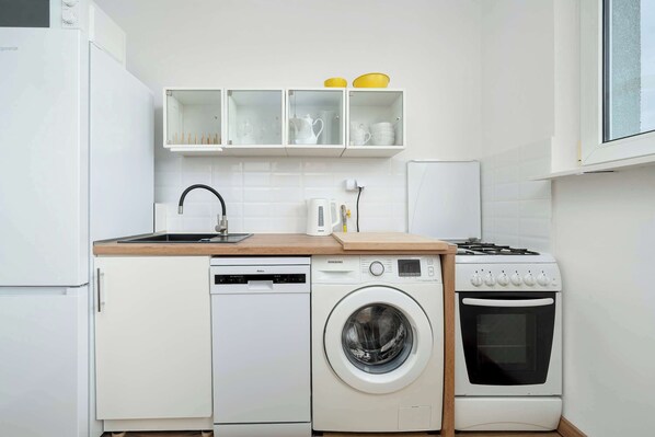 Gas hob, oven, dishwasher, washing machine, electric kettle, fridge-freezer, microwave, set of crockery, kitchen utensils, table and chairs