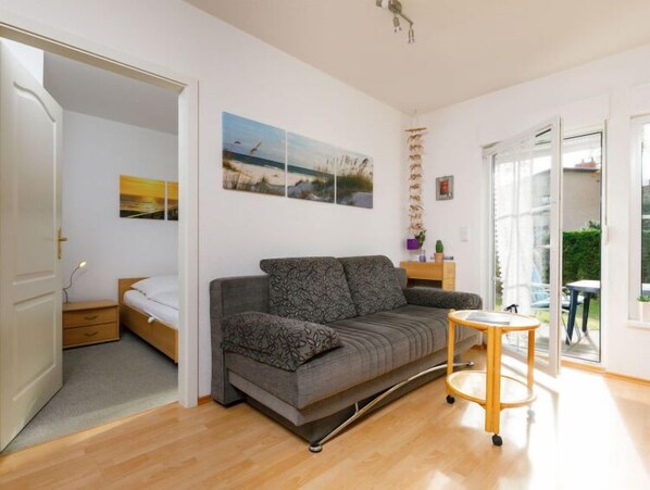 "Berg", 3-værelse-lejlighed 40 m2, i stueetagen. Stue/spisestue med kabel-TV (fladskærms TV), radio, cd og DVD. Udgang til terrasse. 1 værelse med 1 dobbeltseng. 1 værelse med 1 x 2 køjesenge, kabel-TV (fladskærms TV). Kogeniche (miniovn, opvaskemaskine, 2 keramiske kogeplader, Brødrister, kedel, mikroovn, elektrisk kaffemaskine). Brus/WC. Terrasse. Havemøbler. Til benyttelse: højstol, barneseng. Internet (trådløs LAN [WLAN], gratis). Parkeringsplads (1 Bil) ved huset. Bemærk venligst: ikke-ryger lejlighed. Brandalarm.