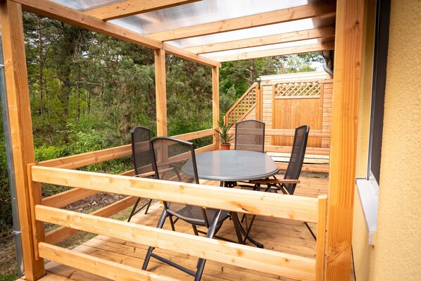Bungalow med 2 soveværelser og en hyggelig stue med spiseplads, tekøkken og sofa. På den idylliske grund er der en terrasse til afslapning og grill til rådighed. Bungalowen er moderne indrettet og udstyret med tv, kabel eller satellitforbindelse og radio.