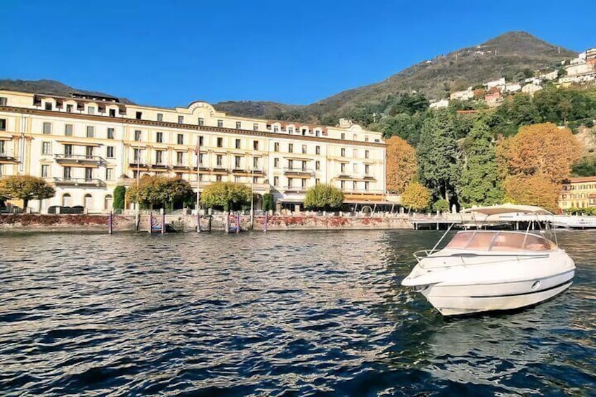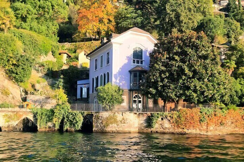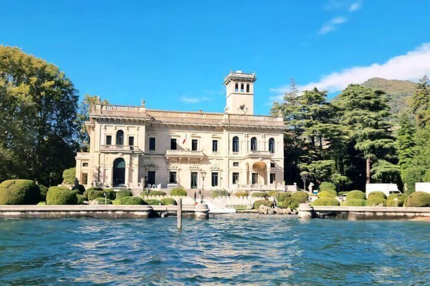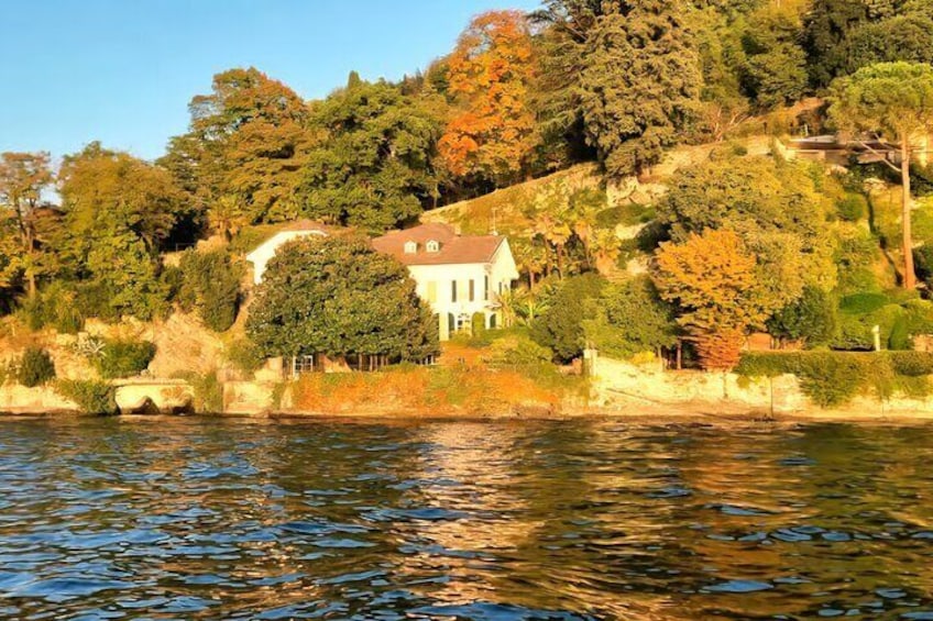 Oplev Villa Oleandra: Et dyk ned i luksus ved Comosøen Ved at booke denne oplevelse vil rejsende få mulighed for at beundre den berømte Villa Oleandra, George Clooneys berømte residens, beliggende i den charmerende landsby Laglio, ved bredden af ​​Comosøen. Fra vores båds komfort vil du sejle langs denne ikoniske ejendom, kendt for sin elegante arkitektur, frodige haver og betagende udsigt over søen. Efterhånden som du kommer tættere på villaen, vil vores ekspertguide dele fascinerende anekdoter og historiske ting om ejendommen og fortælle dig om dens forvandling til et luksuriøst tilbagetog og dets betydning for regionen. Du kan tage uforglemmelige billeder af dette eksklusive sted, med søens rolige vand og de omkringliggende bjerge som den perfekte kulisse.