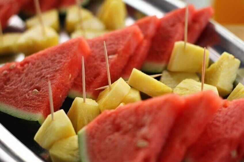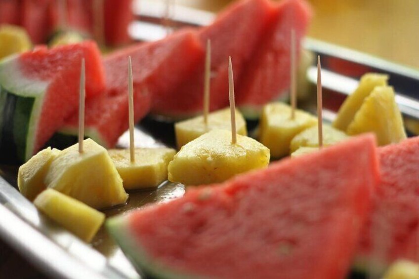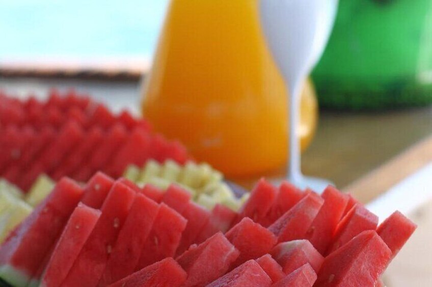 Vi stopper ved den spektakulære bugt Cala Bassa i halvanden time, hvor du kan svømme, snorkle, padle, surfe, nyde vores vandcykler eller slappe af på dækket og nyde den spektakulære udsigt, mens du smager på det udvalg af spanske tapas, som vi har tilberedt om bord, mens du nyder et glas Cava Sangria, øl eller sodavand fra vores åbne bar.