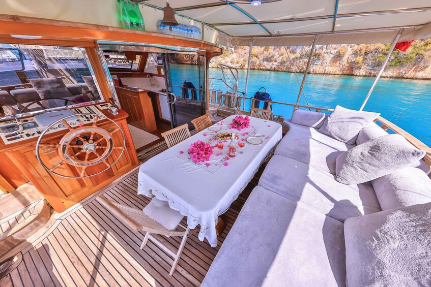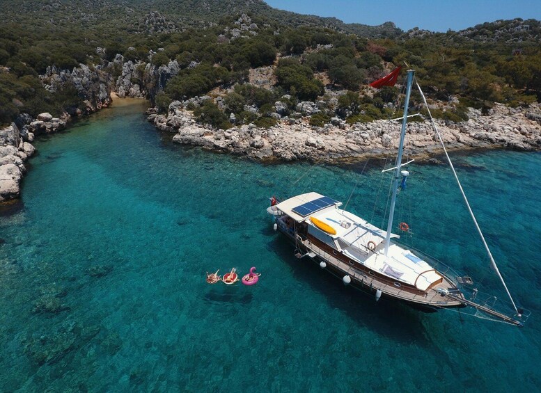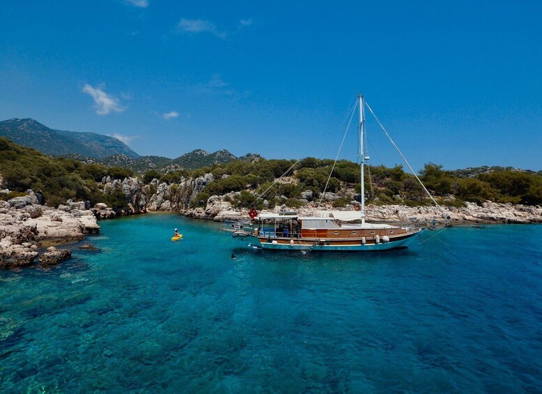 Bådturene begynder kl. 9.30 eller 10.00, når du sejler fra Kas Havn til dit første stop i Yarilgan Bay, hvor du kan holde en badepause. I denne vidunderlige bugt kan du nyde havet ved at bruge beskyttelsesbriller og svømmefødder, som findes på dækket. Iagttag fiskene i vandet på denne fredfyldte ø, eller nyd at deltage i aktiviteter som paddle boarding.