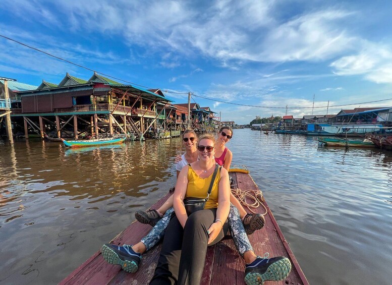 Fortsæt med at tage en lokal båd fra færgen for at udforske den berømte flydende landsby Kampong Phluk. Der kan du på første hånd se, hvordan hverdagen er for de mange familier, der primært lever af fiskeri. De fleste familier bor ved søbredden i farvestrålende huse på lange pæle, så den høje vandstand er ikke noget problem i regntiden.