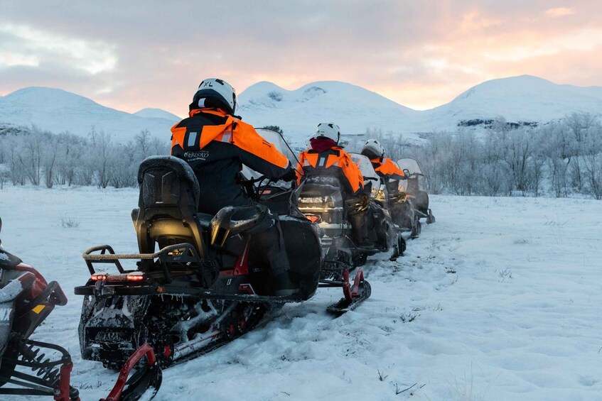 Aktiviteter i Abisko er din indgang til en arktisk oplevelse, som vil efterlade dig med ærefrygt og lyst til mere. Gør dig klar til en spændende rejse gennem uberørte sneklædte områder, omgivet af majestætiske bjerge og frosne søer. Udforsk store frosne landskaber, og følg naturskønne stier gennem den arktiske vildmark og Abisko Nationalpark. Oplev spændingen ved at glide gennem puddersneen på vores guidede snescootertur, hvor vores erfarne guider vil sørge for din sikkerhed og samtidig give dig et uforglemmeligt eventyr.